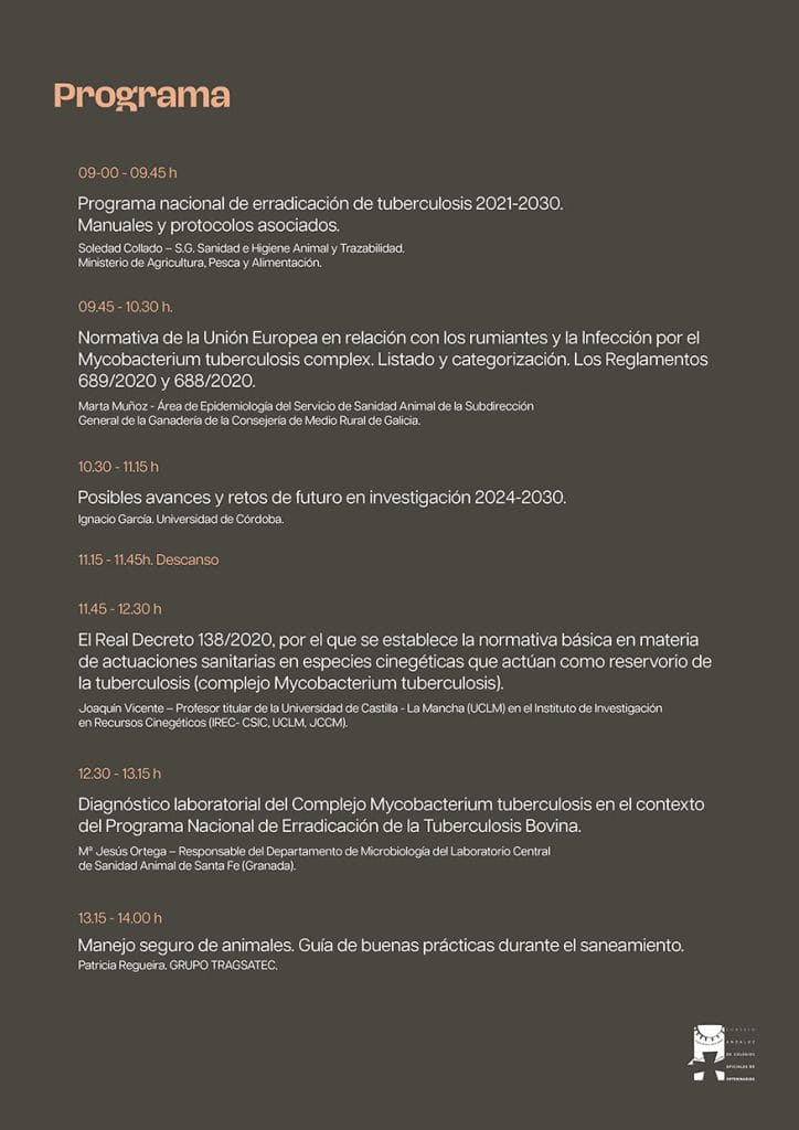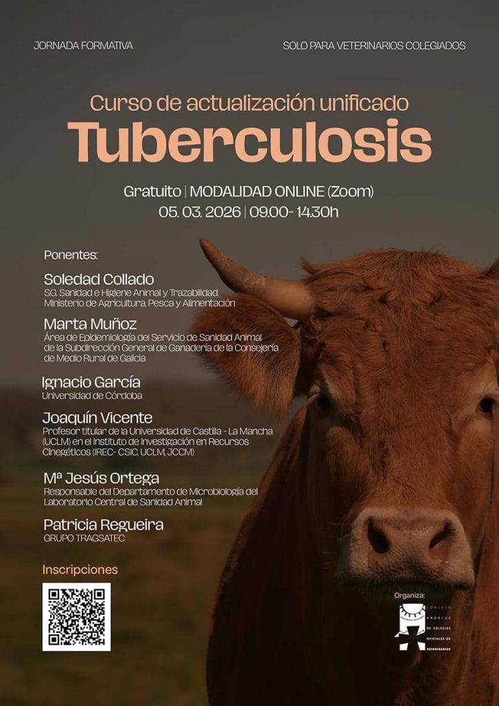 Por medio de la presente, se comunica que, desde el Consejo Andaluz de Colegios Oficiales de Veterinarios, se convoca una nueva formación sobre “Curso de actualización unificado de tuberculosis” que se celebrará en modalidad Online (Zoom) el día 05 de marzo de 2026, en horario de 09:00 a 14:30 horas y que correrá a cargo de los ponentes Soledad Collado, Ángel Camacho, Ignacio García, Mª Jesús Ortega y Patricia Regueira.