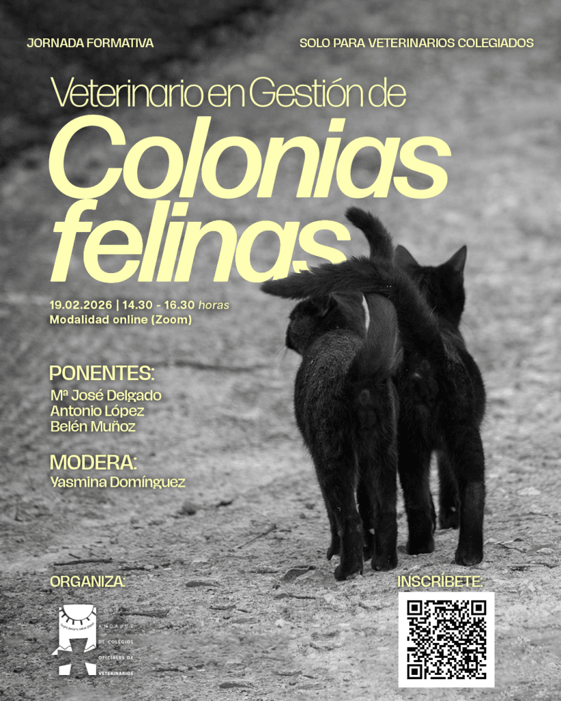 Por medio de la presente, se comunica que, desde el Consejo Andaluz de Colegios Oficiales de Veterinarios, se convoca una nueva formación sobre “Veterinario en gestión de colonias felinas” que se celebrará en modalidad Online (Zoom) el día 19 de febrero de 2026, en horario de 14:30 a 16:30 horas y que correrá a cargo de los ponentes María José Delgado García, Antonio López Carrasco y Belén Muñoz López; Moderada por Yasmina Domínguez Cardona.
