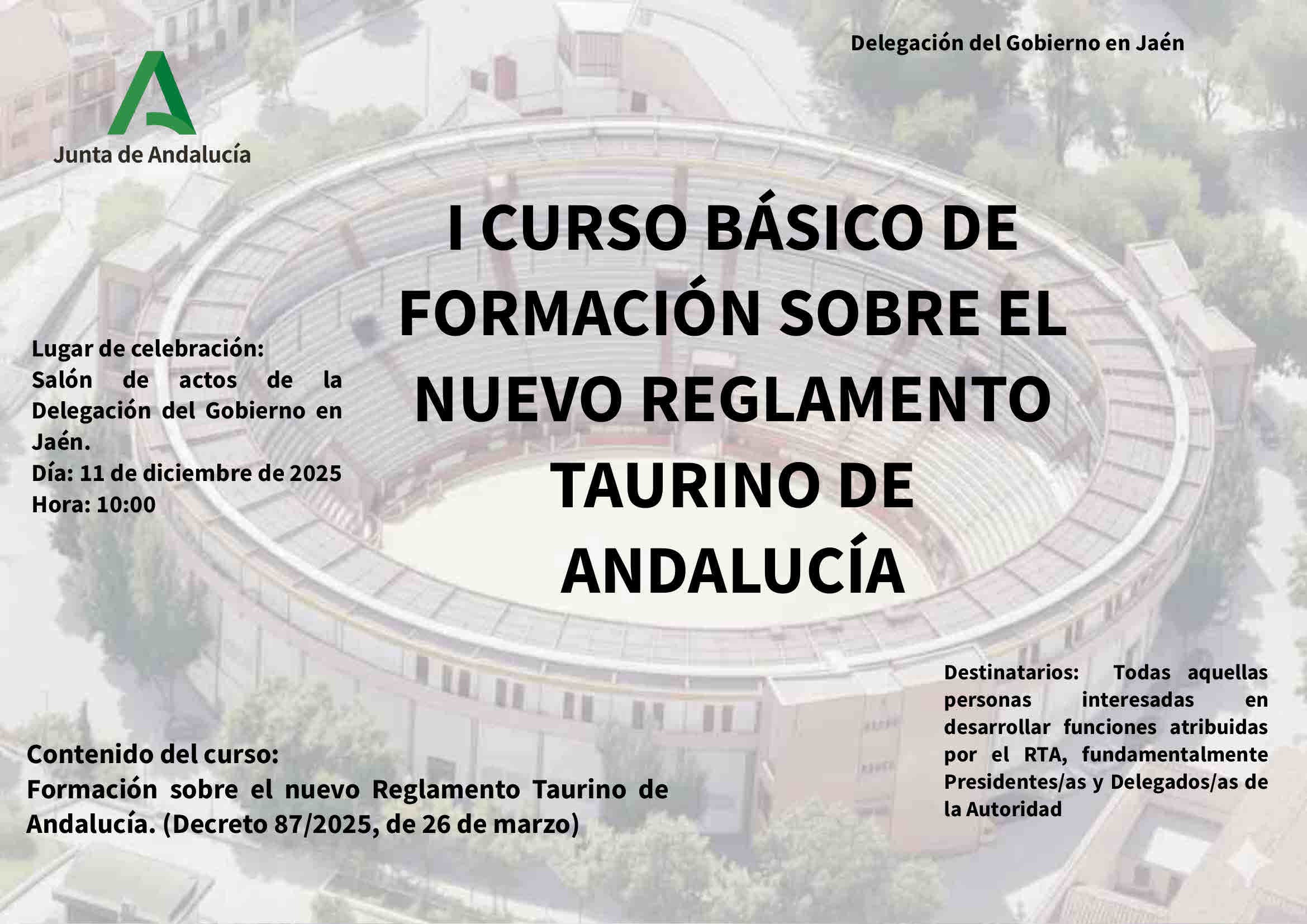 El día 11 de diciembre de 2025, a las 10:00 horas, va a tener lugar en el Salón de Actos de la Delegación del Gobierno en Jaén, la celebración del I Curso Básico de Formación sobre el nuevo Reglamento Taurino de Andalucía, aprobado por Decreto 87/2025, de 26 de marzo (BOJA núm. 61, de 31 de marzo), organizado por la Secretaría General de Interior con la colaboración de la Delegación del Gobierno de Jaén.