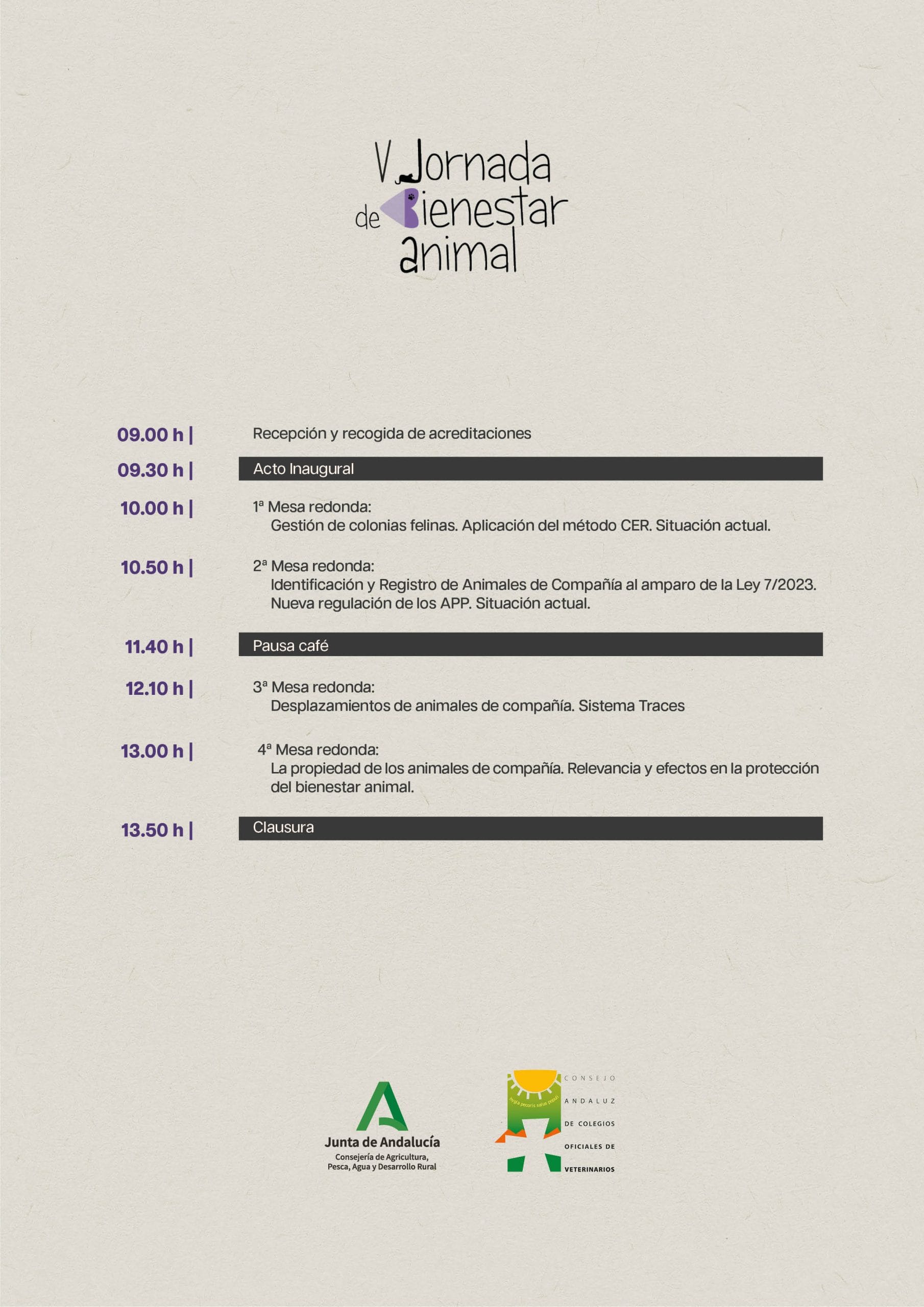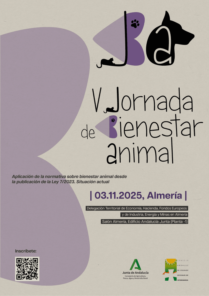 Por medio de la presente, se comunica que, desde el Consejo Andaluz de Colegios Oficiales de Veterinarios, en colaboración con la Consejería de Agricultura, Pesca, Agua y Desarrollo Rural, se convoca la “V Jornada de Bienestar Animal. Aplicación de la Normativa sobre Bienestar Animal desde la Publicación de la Ley 7/2023. Situación Actual” que se celebrará en modalidad presencial el día 03 de noviembre de 2025, a las 09:00 horas y que tendrá lugar en la Delegación Territorial de Economía, Hacienda, Fondos Europeos y de Industria, Energía y Minas de Almería, en el Salón Almería, Edificio Andalucía Junta, planta -1.