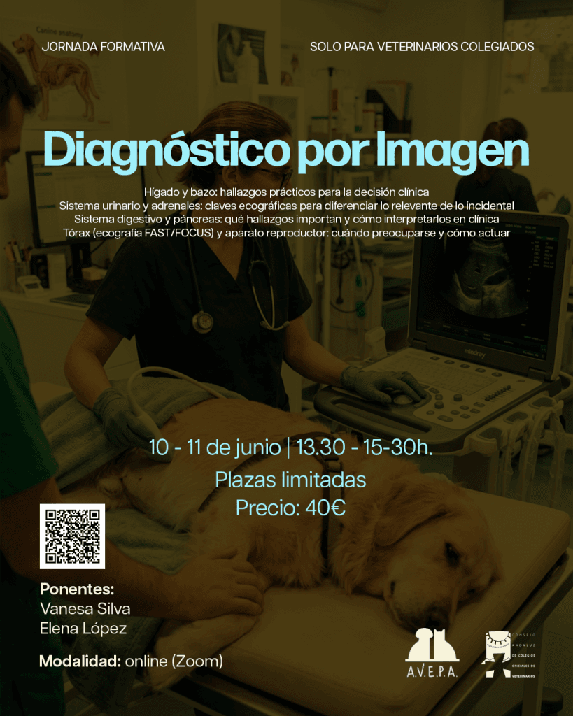 El Consejo Andaluz de Colegios Oficiales de Veterinarios, en colaboración con la Asociación de Veterinarios Españoles Especialistas en Pequeños Animales (AVEPA), se convoca una nueva jornada formativa sobre “Diagnóstico por imagen” que se celebrará en modalidad online (Zoom) los días 10 y 11 de junio de 2026, en horario de 13:30 a 15:30 horas y que correrá a cargo de las ponentes Vanesa Silva y Elena López.