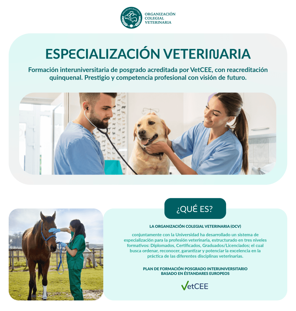 Nuestra presentación de la Especialización Veterinaria en España se enfoca en el proyecto que la Organización Colegial Veterinaria (OCV) pondrá en marcha este año, para ello, el lunes 16 de febrero a las 20.00H. en el salón de actos del Colegio de Veterinarios de Jaén, en modalidad presencial y online, tendrá lugar una sesión informativa sobre ello.
